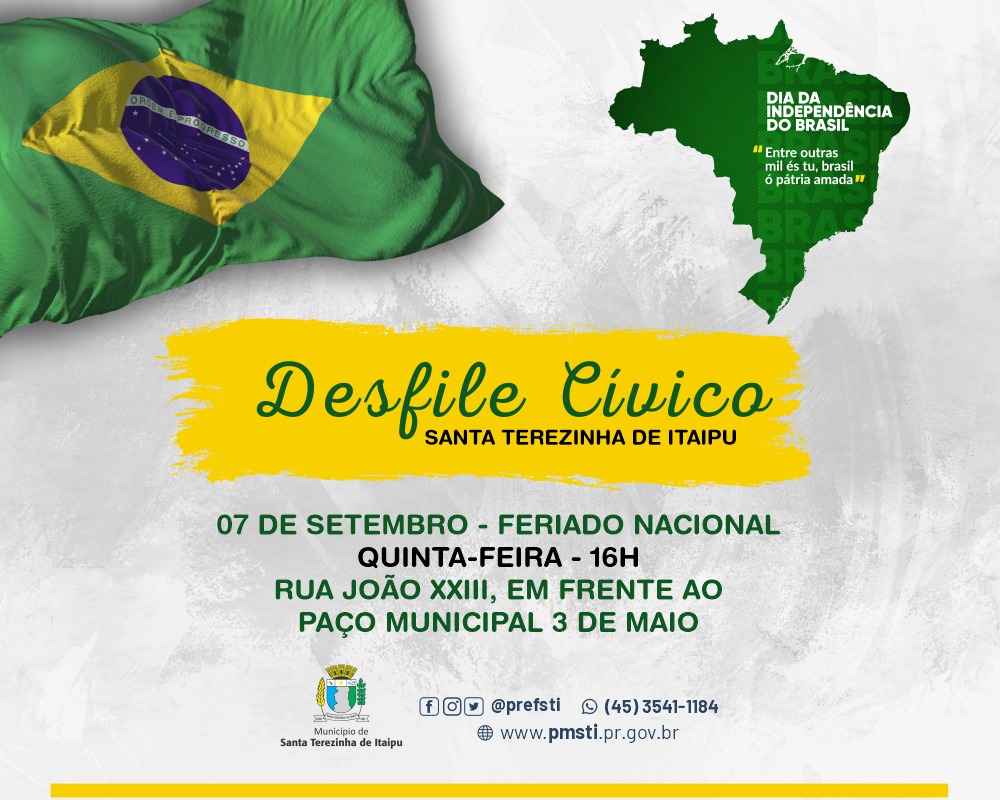 Santa Terezinha de Itaipu realizada nesta quinta-feira, 7, o Desfile Cívico em comemoração ao Dia da Independência do Brasil. O evento será realizado a partir das 16h, tendo como trajeto a Rua João XXIII. O esperado é que mais de 5 mil pessoas prestigiem o evento.