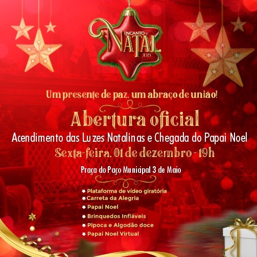 A abertura oficial conta ainda, com a Carreta da Alegria, brinquedos infláveis, Papai Noel Virtual, plataforma 360º e distribuição de pipoca e algodão doce para as crianças. “Você e sua família são nossos convidados especiais para viver com a gente a magia do Encanto de Natal, nesta sexta-feira, 1º de dezembro, a partir das 19h. Será uma noite mágica para todas as famílias itaipuenses e visitantes”, destacou a prefeita Karla Galende.