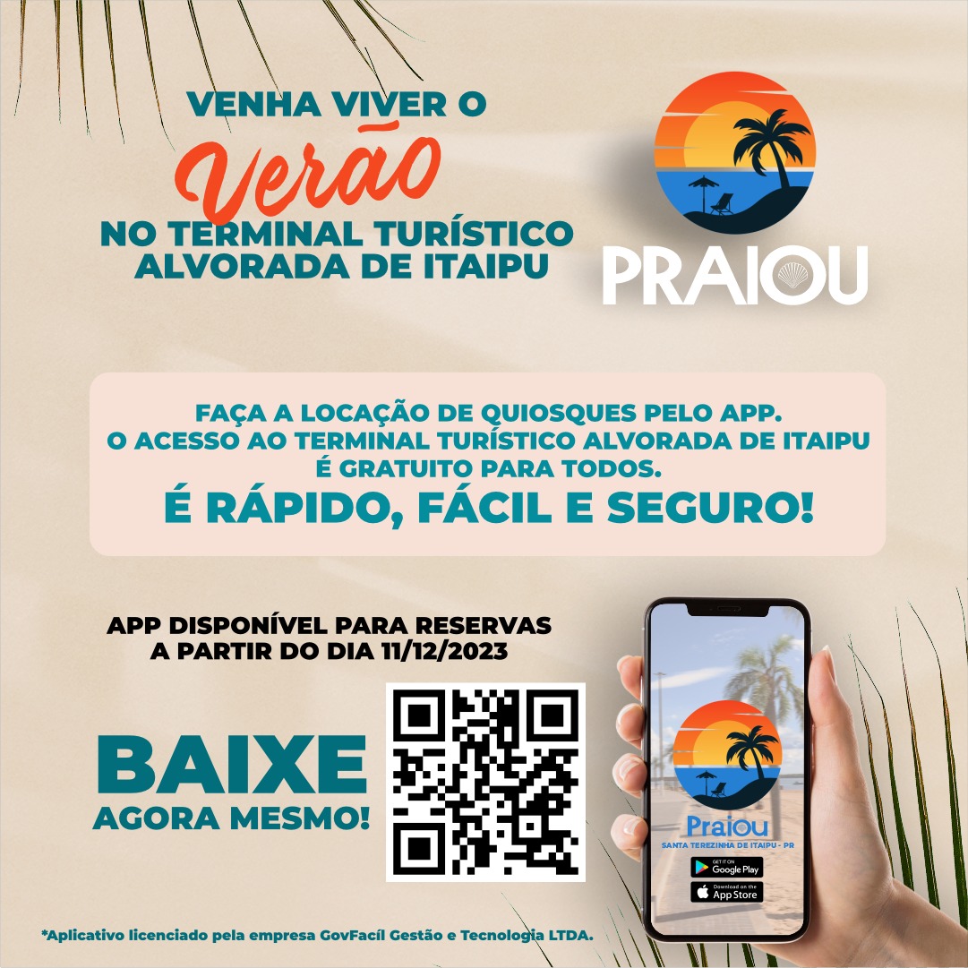 Será que vai dar praia? Se depender da gente, vai sim! A partir do próximo sábado, 16, a população itaipuense e os visitantes do Terminal Turístico Alvorada de Itaipu, poderão realizar a reserva de quiosques, por meio do aplicativo PRAIOU. Além disso, os moradores de Santa Terezinha de Itaipu terão 50% de desconto na locação dos quiosques.