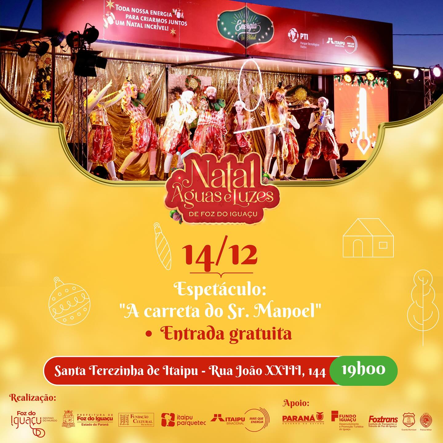 Neste sábado, 14, o Encanto de Natal de Santa Terezinha de Itaipu será palco do Espetáculo Energia de Natal – Oficina do Senhor Manoel, a partir das 19h, na Praça do Paço Municipal 3 de Maio. “A programação do nosso Natal segue repleta de atrações, levando a magia de uma das épocas mais especiais do ano para as famílias itaipuenses e visitantes. Todos estão convidados”, ressalta a prefeita Karla Galende.