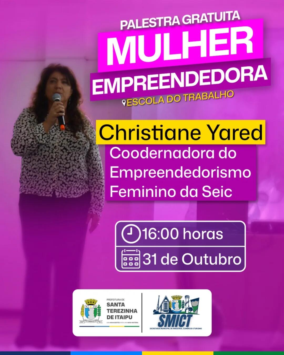 A Prefeitura de Santa Terezinha de Itaipu, por meio da Secretaria Municipal de Indústria, Comércio e Turismo, realiza nesta quinta-feira (31) a palestra “Mulher Empreendedora”, voltada especialmente para mulheres que desejam se inspirar e fortalecer sua atuação no mundo dos negócios. O encontro acontece a partir das 16h, na Escola do Trabalho, com entrada gratuita.