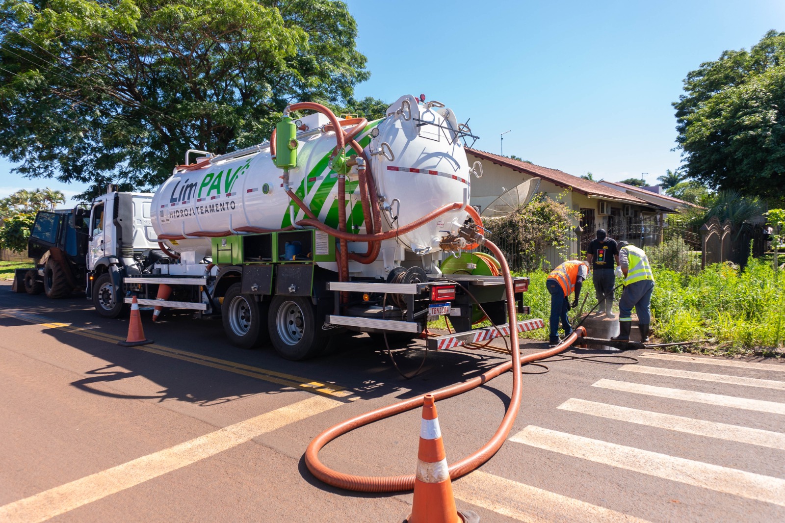 Pela primeira vez em Santa Terezinha de Itaipu, o serviço está sendo realizado com o caminhão de hidrojato, um equipamento moderno que utiliza jatos de água em alta pressão para fazer a limpeza e desobstrução completa das redes de drenagem.