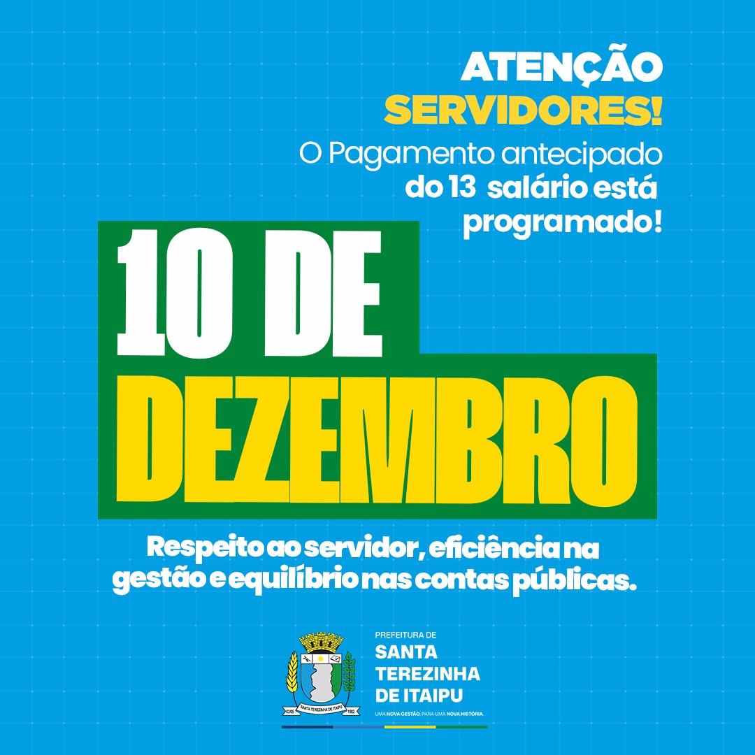 A Prefeitura de Santa Terezinha de Itaipu realiza, nesta quarta-feira (10), o pagamento antecipado da segunda parcela do 13º salário aos servidores municipais. Com a medida, serão injetados quase R$ 1,5 milhão na economia do município, fortalecendo o setor comercial neste período de fim de ano.